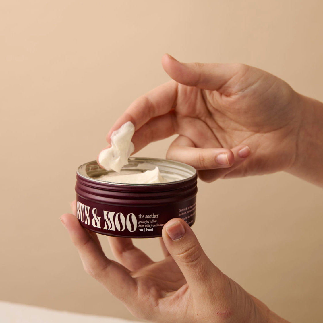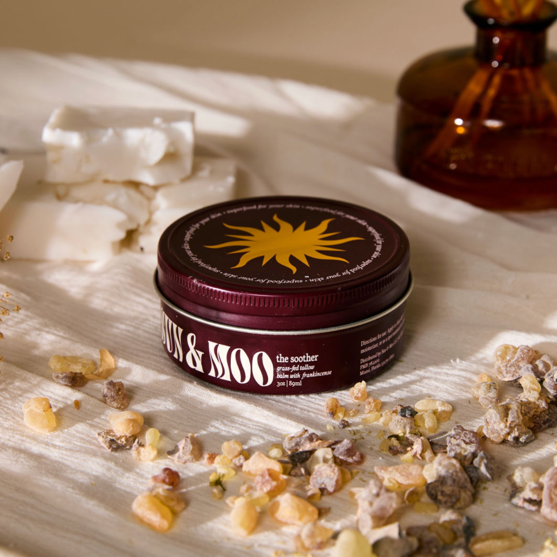 The Soother Tallow Balm is a gentle yet powerful remedy for skin in need of care and repair. Infused with organic frankincense resin, this balm nourishes, calms, and restores, making it perfect for dry skin, eczema, psoriasis, and even minor cuts or burns. The slow infusion process captures all the healing properties of frankincense, blending them seamlessly with the deeply nourishing power of grass-fed tallow. The result? A smooth, radiant complexion and skin that feels rejuvenated and protected. Say goodbye to dry, irritated skin and hello to calm, soothed, and nourished skin with The Soother.