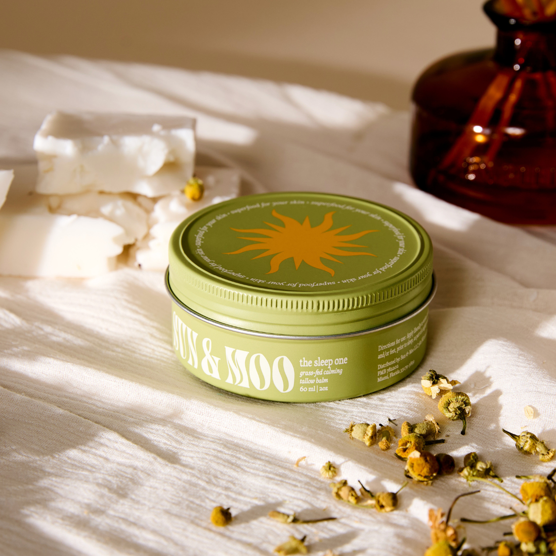Sun & Moo's The Sleep One Tallow Balm is a gentle yet effective remedy for skin in need of care and relaxation. Made with Grass-fed & Grass-finished Suet Tallow, this balm deeply nourishes and hydrates, helping to soothe dryness, irritation, and minor skin concerns like eczema and psoriasis. Infused with calming Magnesium Chloride Oil and a serene blend of Organic Cedarwood, Lavender, Neroli, Chamomile, and Sandalwood Essential Oils, it promotes relaxation while restoring your skin’s vitality. Embrace calm, soothed, and rejuvenated skin with The Sleep One.