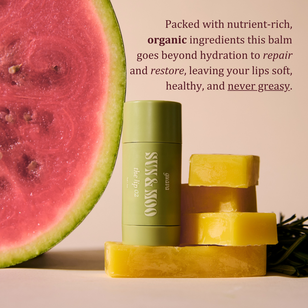 Enhance your lips with Sun & Moo's All-Natural Guava- Infused Lip Balm. 3x the size of traditional balm, this luxurious blend of organic ingredients deeply hydrates while adding a subtle natural fragrance from guava oil. Formulated with grass-fed suet tallow, organic castor oil, and jojoba oil, it delivers lasting moisture and soothing care. Organic beeswax locks in hydration, refined shea butter nourishes deeply, and antioxidant-rich guava oil leaves your lips soft, smooth, and beautiful.